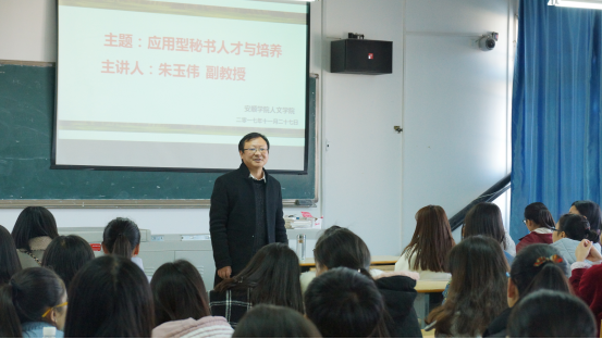 11月28日下午,154.com皇冠“应用型秘书人才与培养”知识讲座在新教学楼0B32教室开展。154.com皇冠党政办朱玉伟副教授主讲,154.com皇冠2016、2017级秘书学专业全体同学认真聆听了讲座。
